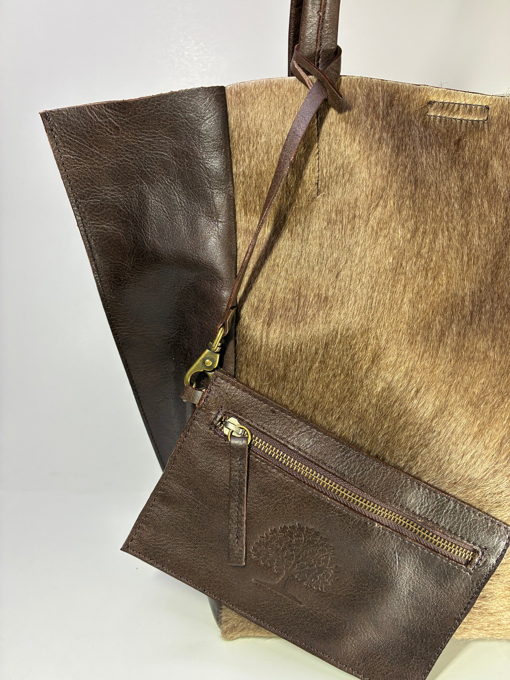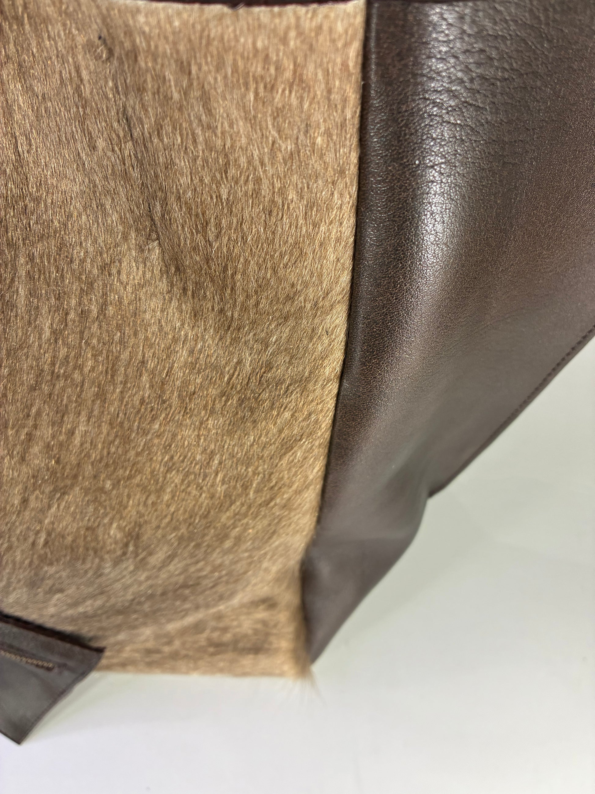 Cartera de cuero vacuno con pelo y terminaciones en cuero vacuno.